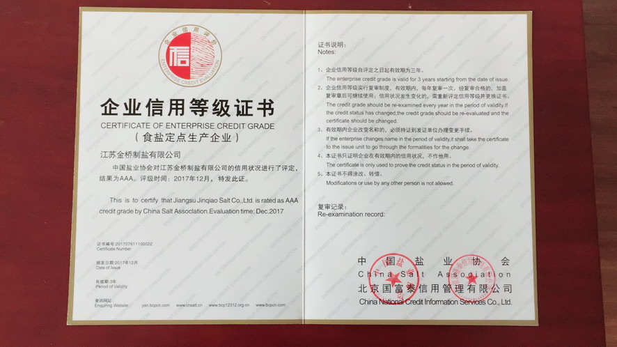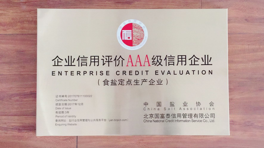 按照主營業(yè)務(wù)收入、利潤、主營業(yè)務(wù)收入利稅率及主營業(yè)務(wù)增速四項(xiàng)指標(biāo)評價,2016年集團(tuán)公司被中國輕工業(yè)聯(lián)合會和中國鹽業(yè)協(xié)會評為中國輕工業(yè)制鹽行業(yè)十強(qiáng)企業(yè)。根據(jù)《社會信用體系建設(shè)規(guī)劃綱要(2014—2020)》,經(jīng)第三方專業(yè)評價機(jī)構(gòu)和中國鹽業(yè)企業(yè)信用等級評價委員會審核并向社會公示,2016年江蘇金橋制鹽有限公司被評為AAA級食鹽生產(chǎn)企業(yè)。