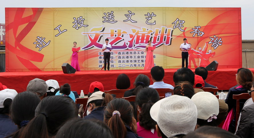 10月11日下午,由連云港市總工會主辦、集團公司承辦、市演藝集團演出的“進工投、送文藝、促和諧”文藝演出在灌西投資公司精彩上演,市總工會副主席陳健、集團公司工會主席戴鴻鳴等領導,以及1000余名觀眾觀看了演出。