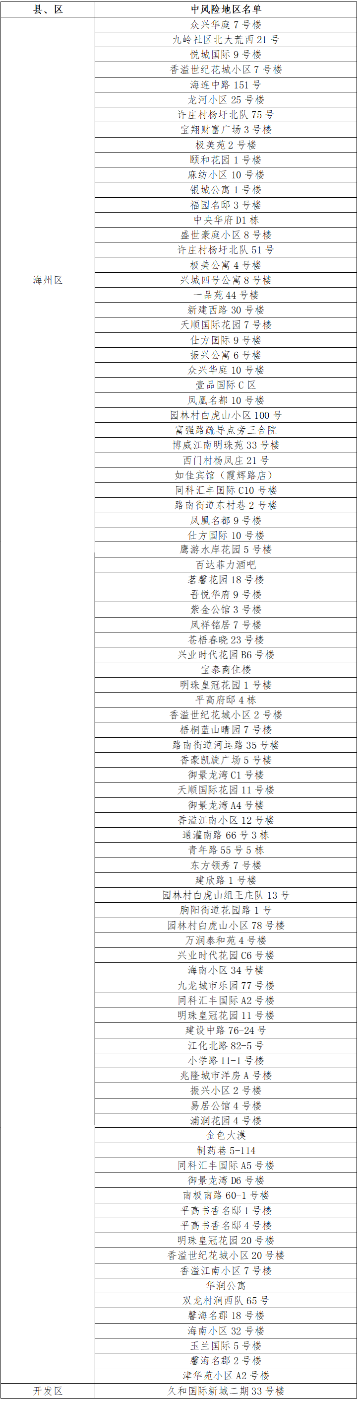 根據(jù)國(guó)務(wù)院聯(lián)防聯(lián)控機(jī)制有關(guān)規(guī)定,經(jīng)市指揮部研究決定,自發(fā)布之日起,對(duì)我市部分區(qū)域疫情風(fēng)險(xiǎn)等級(jí)進(jìn)行調(diào)整:海州區(qū)贛榆雞蛋菜煎餅店(洪門(mén)菜市場(chǎng)門(mén)口)、洪新小區(qū)90-71號(hào),連云區(qū)萬(wàn)潤(rùn)華泰小區(qū)7號(hào)樓,灌云縣南崗鎮(zhèn)崗東村殷莊20號(hào)由中風(fēng)險(xiǎn)地區(qū)調(diào)整為低風(fēng)險(xiǎn)地區(qū)。其他地區(qū)風(fēng)險(xiǎn)等級(jí)不變。調(diào)整后全市現(xiàn)有92個(gè)中風(fēng)險(xiǎn)地區(qū)。 連云港市中風(fēng)險(xiǎn)地區(qū)(92個(gè))