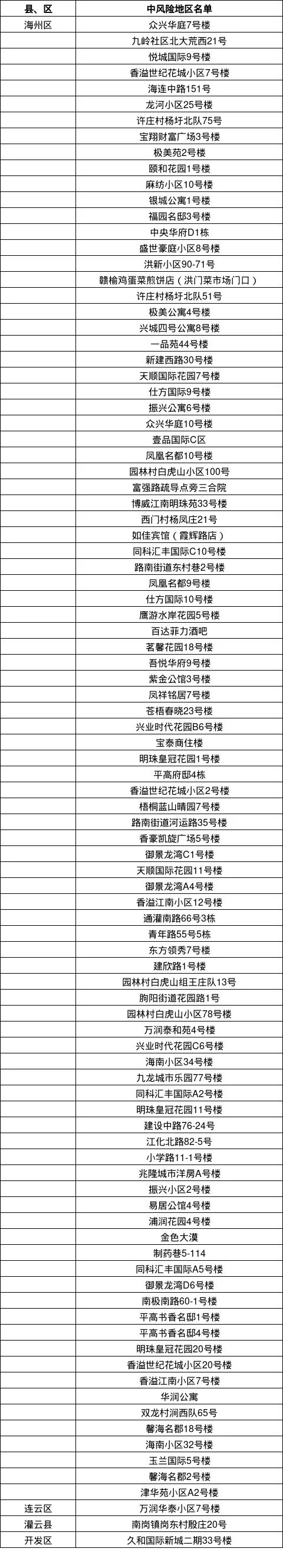 海州區(qū)潤琦苑3號樓、天景美地4號樓、溫僑綠苑B2由中風(fēng)險地區(qū)調(diào)整為低風(fēng)險地區(qū)。