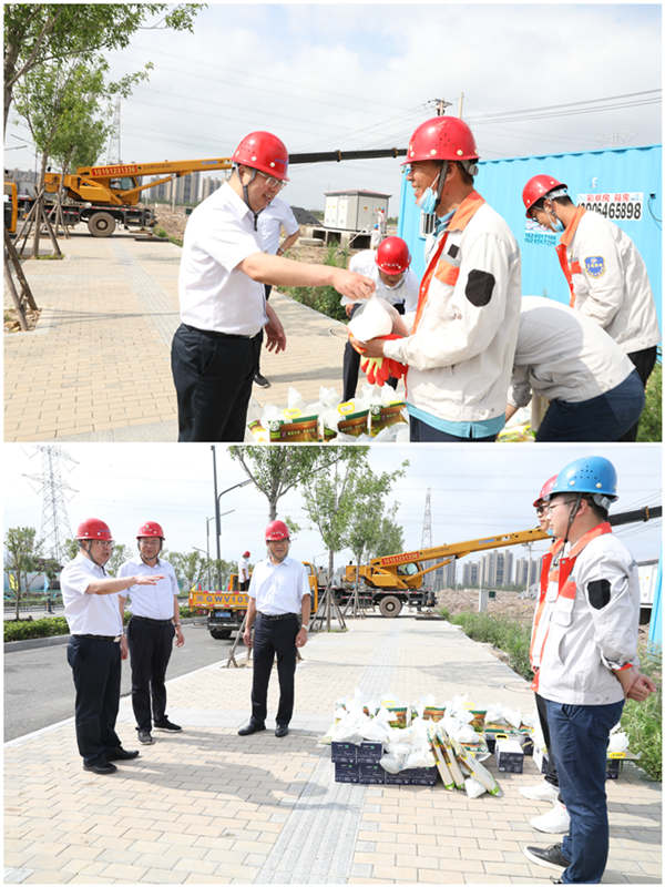 7月28日上午,集團(tuán)公司黨委副書記戴鴻鳴、工會(huì)主席劉承志一行,深入公司施工一線走訪慰問職工,把綠豆、牛奶等防暑降溫用品送到他們手中,在炎炎夏日,為一線職工送去集團(tuán)公司的深切關(guān)懷。 在臺(tái)北工地,戴書記與施工人員親切交談,簡(jiǎn)要了解了工程的施工情況,叮囑他們?cè)谙娜崭邷仄陂g要注意安全,做好防暑降溫措施,確保安全生產(chǎn)和身體健康。(電宣)