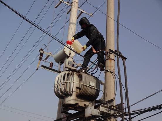圖為維護(hù)人員正在為居民生活區(qū)的變壓器進(jìn)行加油 春節(jié)臨近,為讓廣大居民過(guò)上一個(gè)愉快祥和的春節(jié),保證節(jié)日期間安全供電,灌西供電所積極做好設(shè)備維護(hù)。(王志勇)