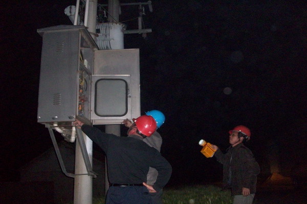 青口供電所為降低線損,采取多種措施消除線路和配變放電隱患。上圖為工人在夜間對(duì)設(shè)備進(jìn)行檢查。(宋中文)