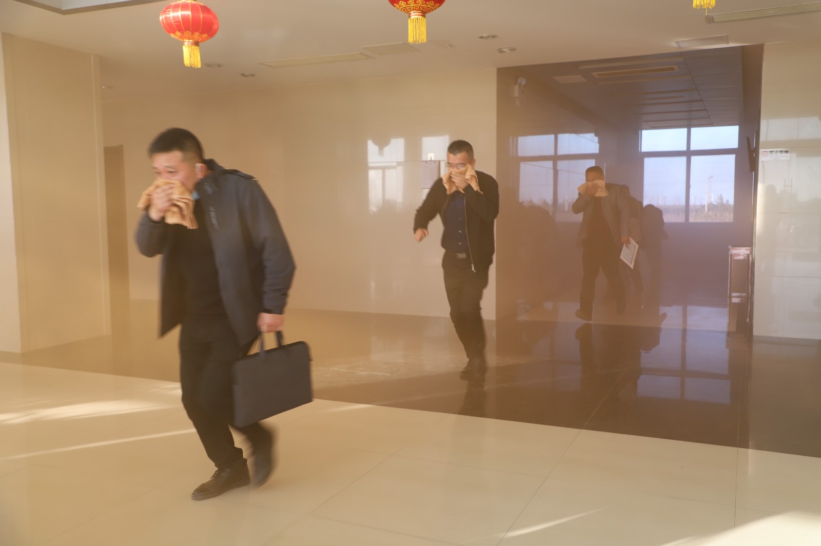 此次實戰(zhàn)演練的“突發(fā)事件”地點設(shè)在機關(guān)大樓,所有參訓(xùn)人員按照既定的消防應(yīng)急預(yù)案進行了一次消防安全模擬演練。隨著“消防警報聲”響起,正在大樓內(nèi)工作的員工在濃煙中用濕巾捂嘴、彎腰、靠墻從樓梯道口迅速有序地疏散、撤離,在假定火災(zāi)發(fā)生條件下進行逃生自救實戰(zhàn)演練。救援組、疏散組、后勤組各組成員各負(fù)其職,配合有序,隨后,大家在樓前廣場上進行了滅火器實戰(zhàn)操作訓(xùn)練。