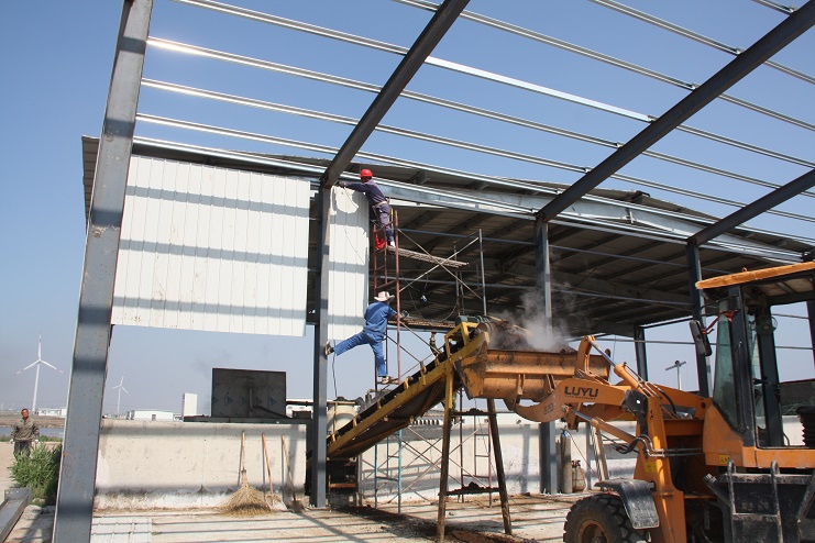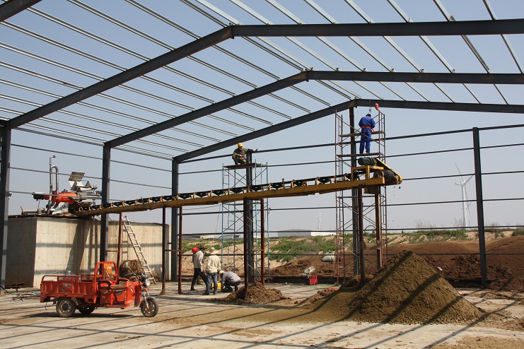 5月18日,位于北北歐農(nóng)莊生豬養(yǎng)殖廠旁邊的綠淮肥業(yè)公司有機(jī)肥生產(chǎn)基地,一個(gè)鋼結(jié)構(gòu)廠房即將完工,只見機(jī)聲轟鳴、焊花飛濺,機(jī)電服務(wù)公司的工人在勞模王緒華帶領(lǐng)下正在焊接鋼結(jié)構(gòu)件,而正在建設(shè)施工中的廠房?jī)?nèi),兩條有機(jī)肥生產(chǎn)線運(yùn)轉(zhuǎn)不停,沒(méi)有因廠房建設(shè)而停產(chǎn),廠房旁邊的一臺(tái)挖掘機(jī)正在整平場(chǎng)地,一邊建設(shè),不邊生產(chǎn),一派紅火景象。