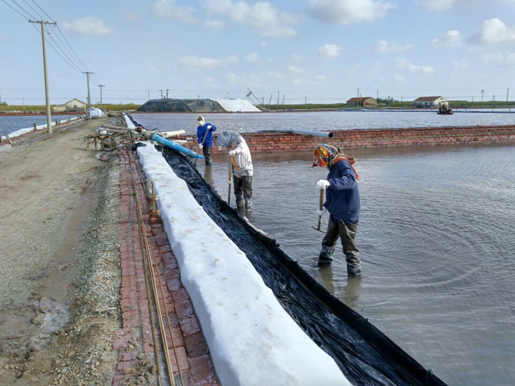 10月6日,在日曬制鹽新河分公司十班,幾名鹽工在不遠處鹽池內整理扒過鹽的格塊,一臺唐三零機械正在最后一塊鹽池內緩緩移動集鹽,鹽泵運轉不停,輸送鹽上廩,一條鹽廩即將筑成。在國慶假日期間,日曬制鹽公司值班人員不脫崗、生產經營不斷線、鹽業(yè)生產不停歇,入秋以來,已扒鹽5萬噸,為公司的國慶假日增添了道道靚麗的風景。