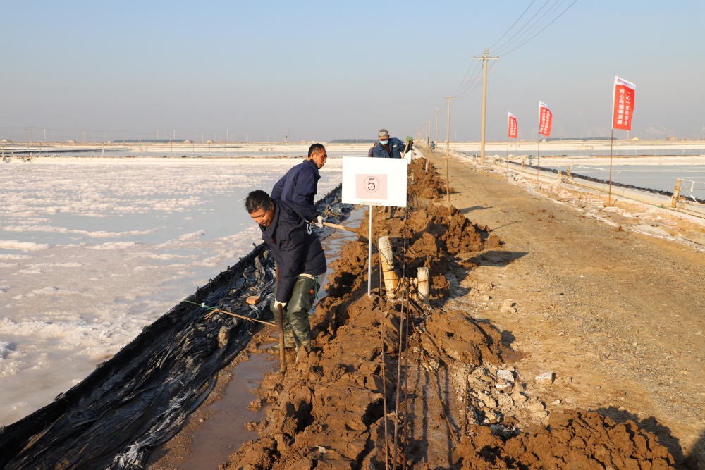 寒冬時(shí)節(jié),暖陽(yáng)之下,鹽廩之旁,曬得黝黑的鹽場(chǎng)產(chǎn)業(yè)工人們按照競(jìng)賽的考核標(biāo)準(zhǔn),做熟泥、打堰墻、做堰頂,護(hù)埝頂、夯埝坡、清塘底,見證了一場(chǎng)技能比拼的盛會(huì)。經(jīng)過(guò)一天的鏖戰(zhàn),潘成軍師徒取得了池堰修整第一名;董治波師徒取得了土塘清淤第一名。(西工)
