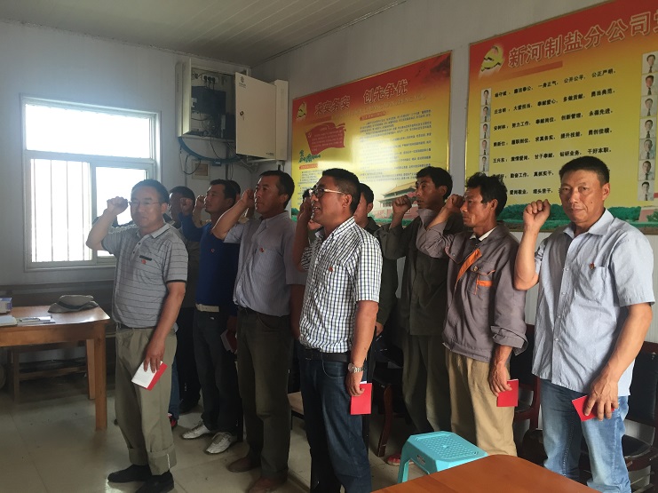 會議最后新河支部全體黨員重溫入黨誓詞。新河黨支部全體黨員起立。由支部書記李加新同志帶領大家宣讀誓詞。(新河支部程龍)