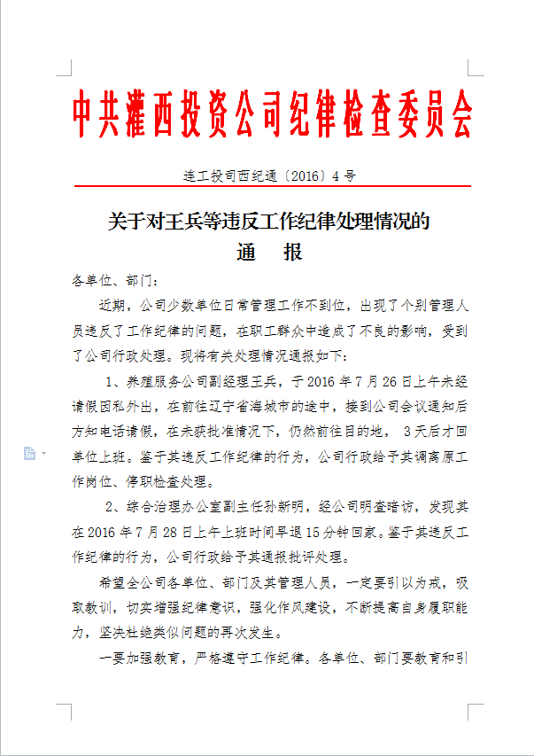關(guān)于對王兵等違反工作紀(jì)律處理情況的通報(bào)