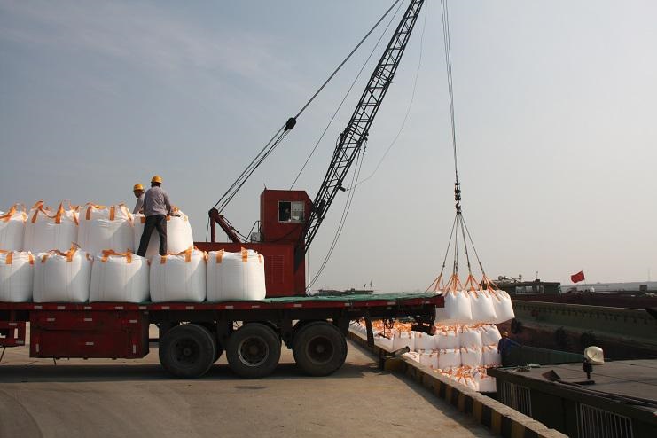 4月30日上午9時(shí)許,隨著一聲汽車長笛,一輛載有近40噸化工物資的卡車徐徐??吭谙笪锪鞴疚骞嗪哟a頭邊,緊接著碼頭鐵臂起舞,機(jī)械操作工嫻熟地操縱著塔吊機(jī)械,準(zhǔn)確地將一包包噸貸物資裝卸在碼頭邊的貨船中。。。。。。自此,一輛輛滿載40余噸貨物的卡車源源不斷向碼頭駛來。