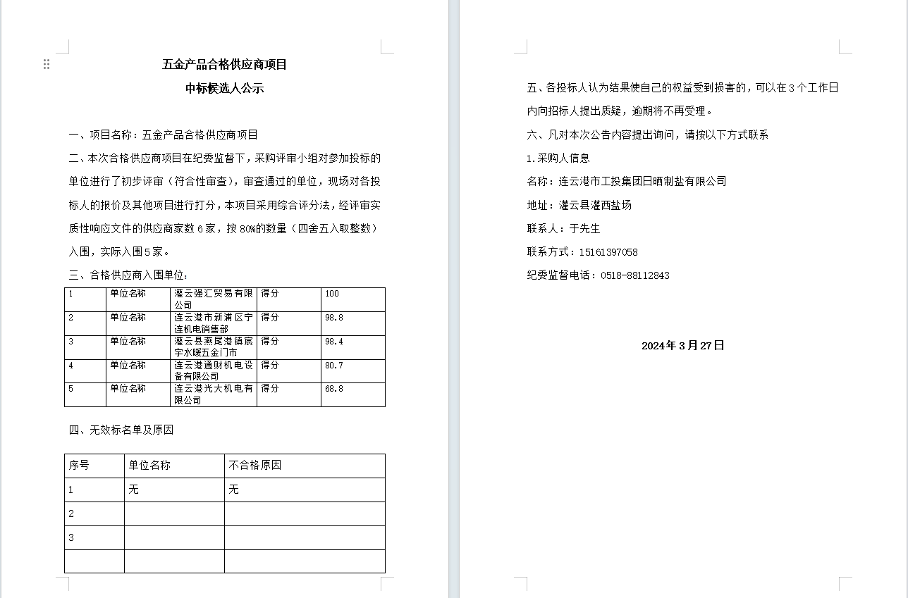 五金產(chǎn)品合格供應(yīng)商項(xiàng)目中標(biāo)候選人公示