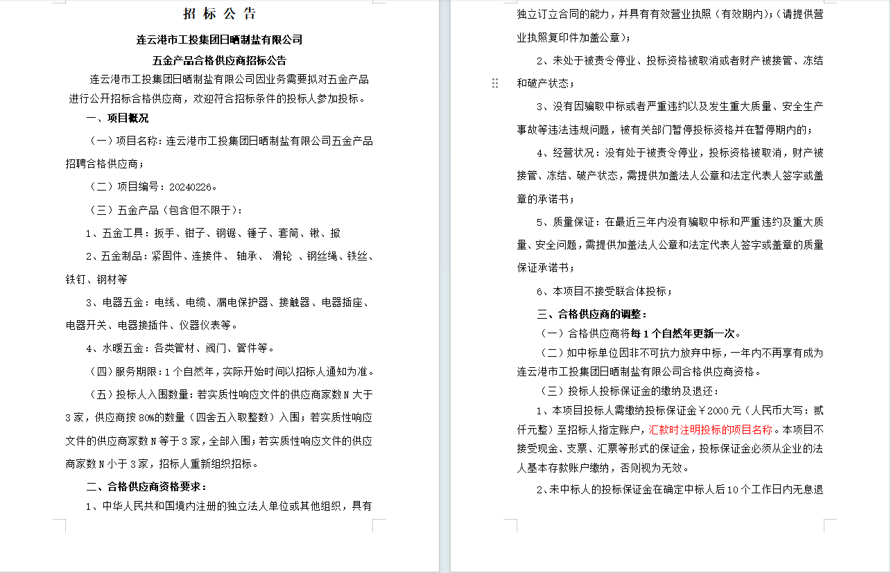 連云港市工投集團日曬制鹽有限公司五金產(chǎn)品合格供應(yīng)商招標(biāo)公告