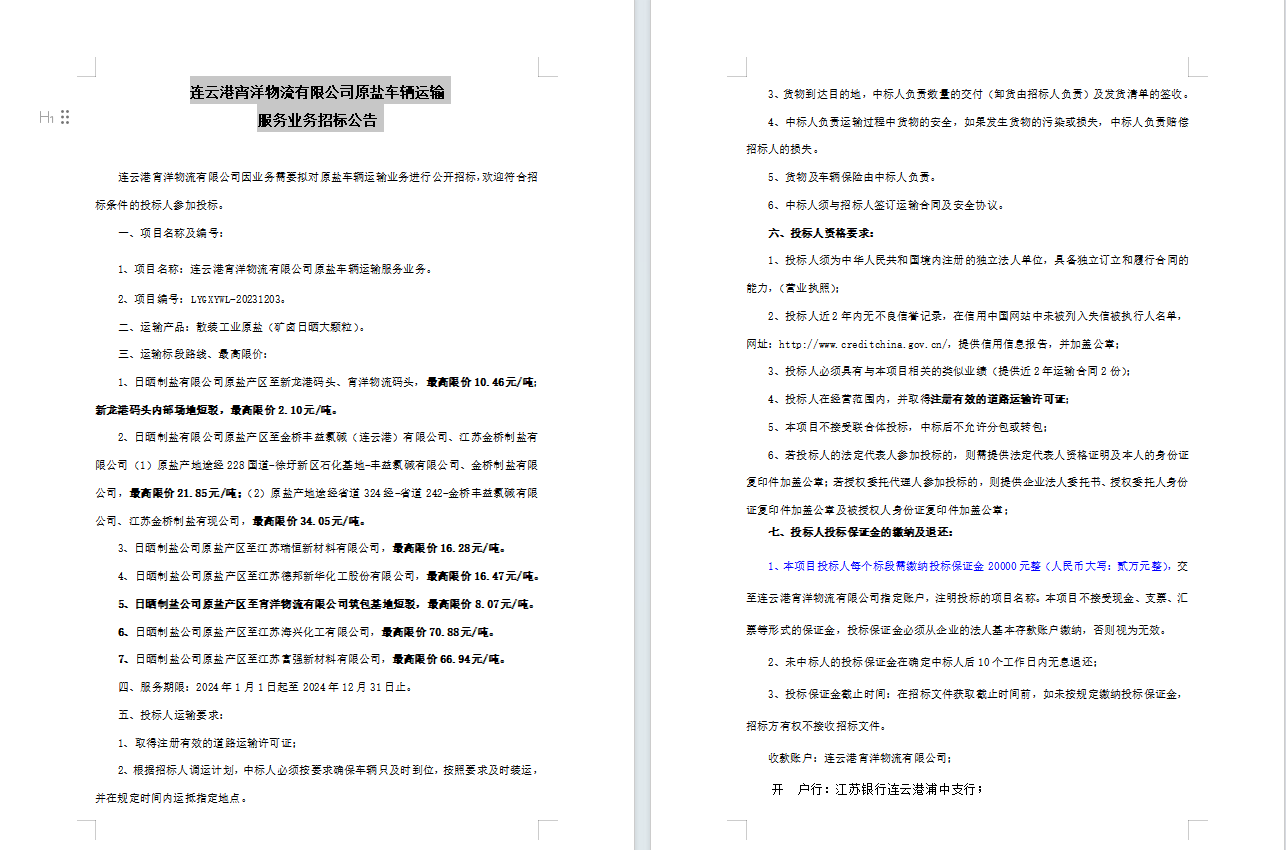 連云港宵洋物流有限公司原鹽車輛運輸服務(wù)業(yè)務(wù)招標(biāo)公告