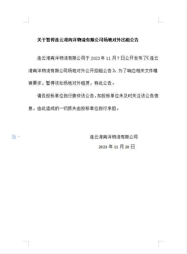 關(guān)于暫停連云港宵洋物流有限公司場地對外出租公告