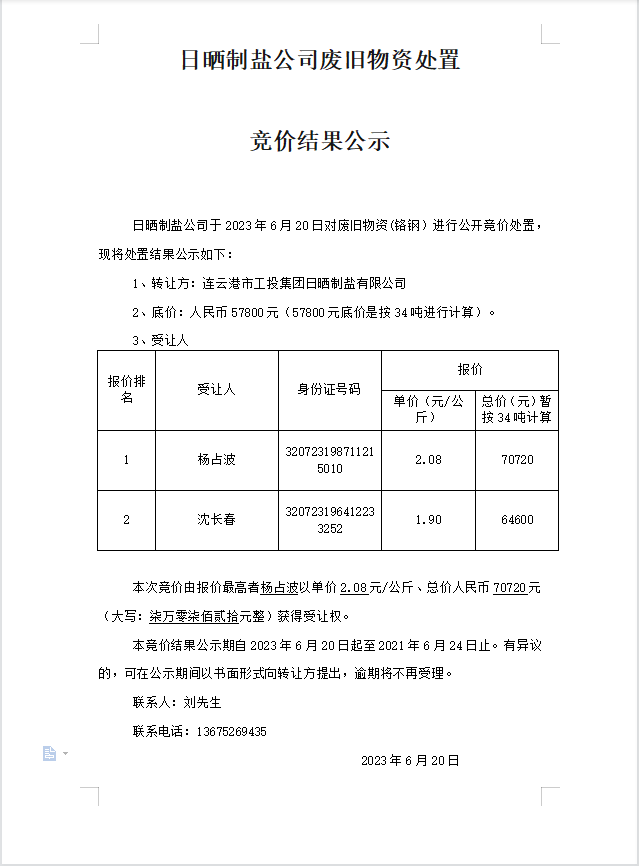 日曬制鹽公司廢舊物資處置競價結(jié)果公示