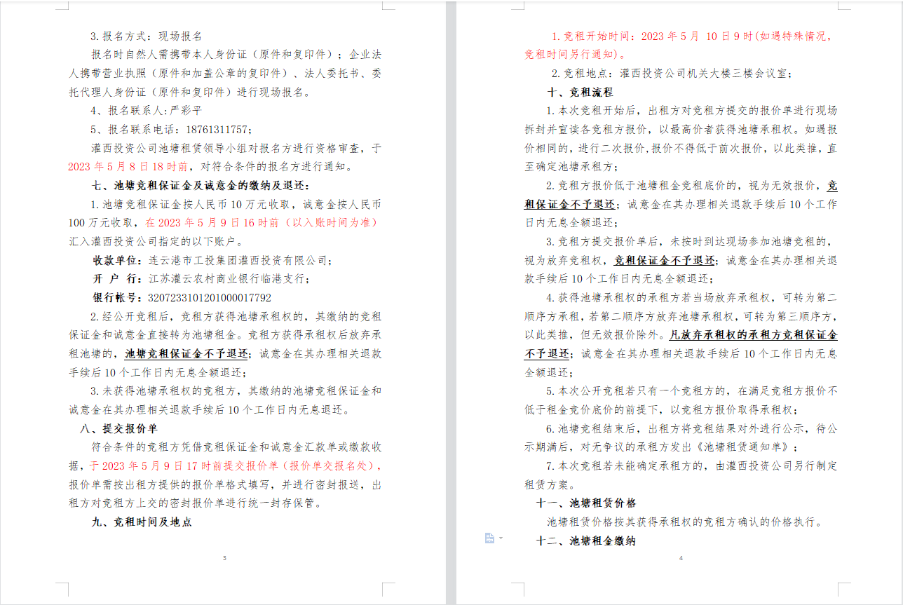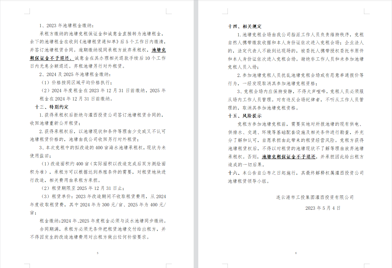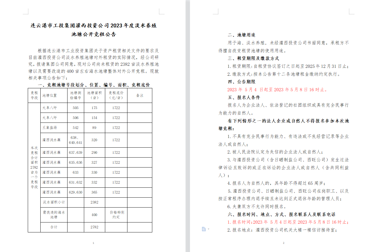 連云港市工投集團(tuán)灌西投資公司2023年度淡水養(yǎng)殖池塘公開競租公告