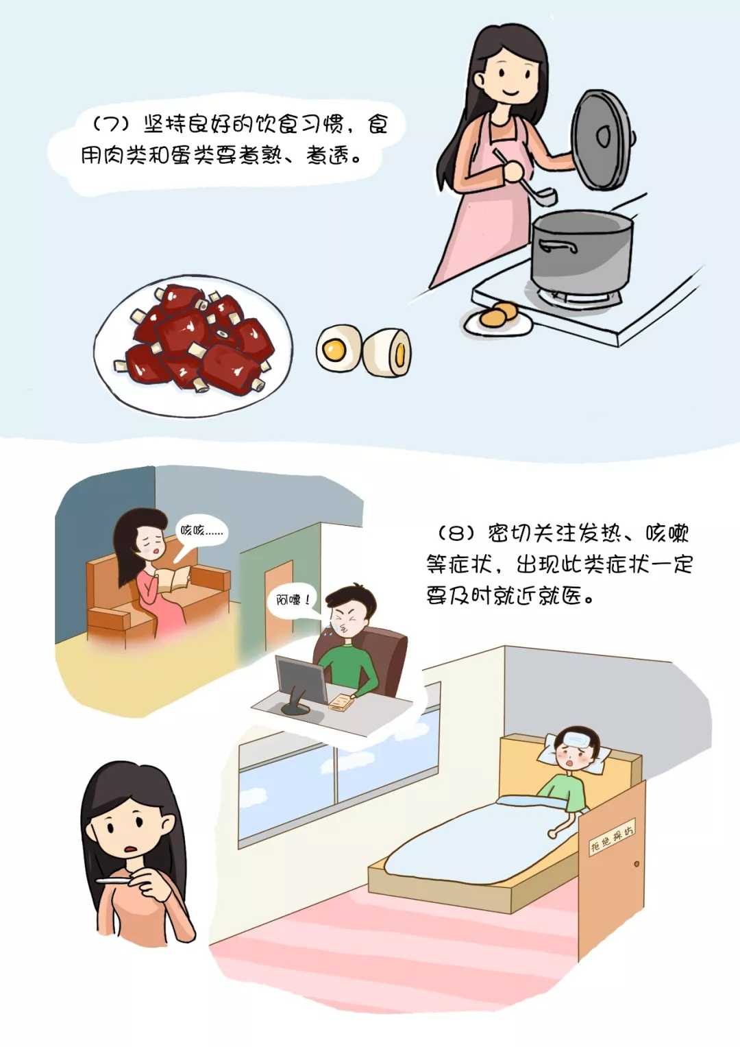 (7)堅(jiān)持良好的飲食習(xí)慣,食用肉類和蛋類要煮熟、煮透。