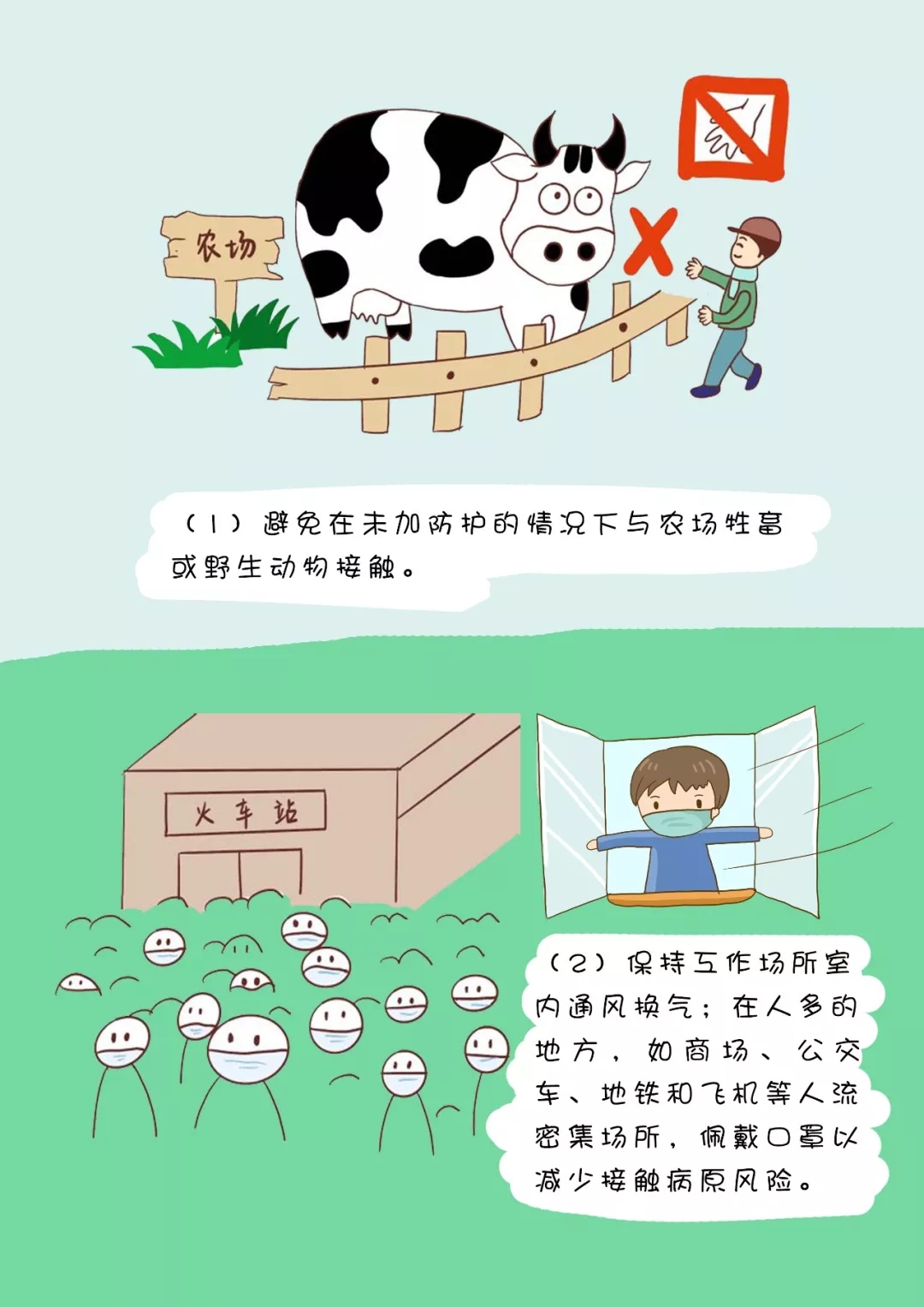 (1)避免在未加防護(hù)的情況下與農(nóng)場(chǎng)牲畜或野生動(dòng)物接觸。