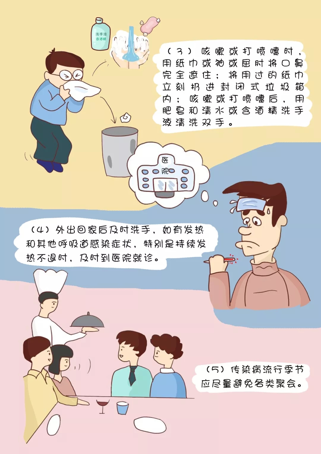(3)咳嗽或打噴嚏時(shí),用紙巾或袖或屈肘將口鼻完全遮住;將用過的紙巾立刻扔進(jìn)封閉式垃圾箱內(nèi);咳嗽或打噴嚏后,用肥皂和清水或含酒精洗手液清洗雙手。