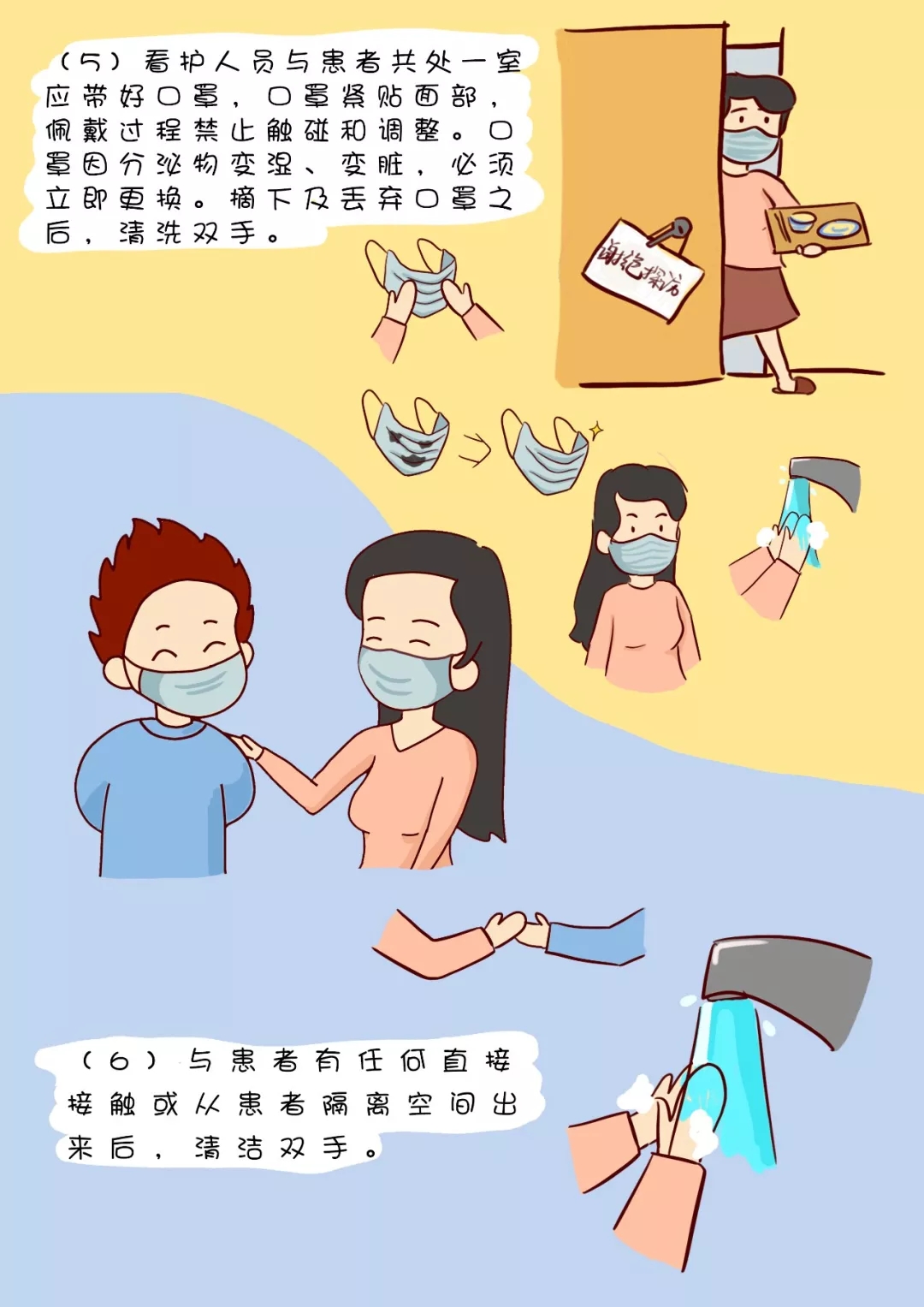 (5)看護(hù)人員與患者共處一室應(yīng)帶好口罩,口罩緊貼面部,佩戴過程禁止觸碰和調(diào)整??谡忠蚍置谖镒儩瘛⒆兣K,必須立即更換。摘下及丟棄口罩之后,清洗雙手。