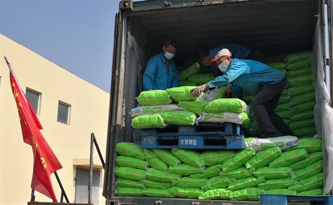 黨員裝卸突擊隊(duì)正在裝運(yùn)小包裝鹽產(chǎn)品