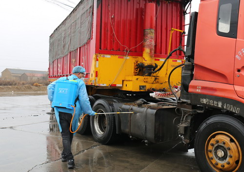 加工鹽車間副主任李畢軍正在對(duì)外來車輛進(jìn)行消毒。