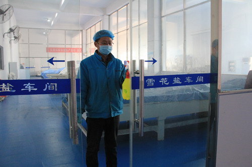 雪花鹽車間主任助理萬平正在對(duì)車間關(guān)鍵區(qū)域進(jìn)行消毒。