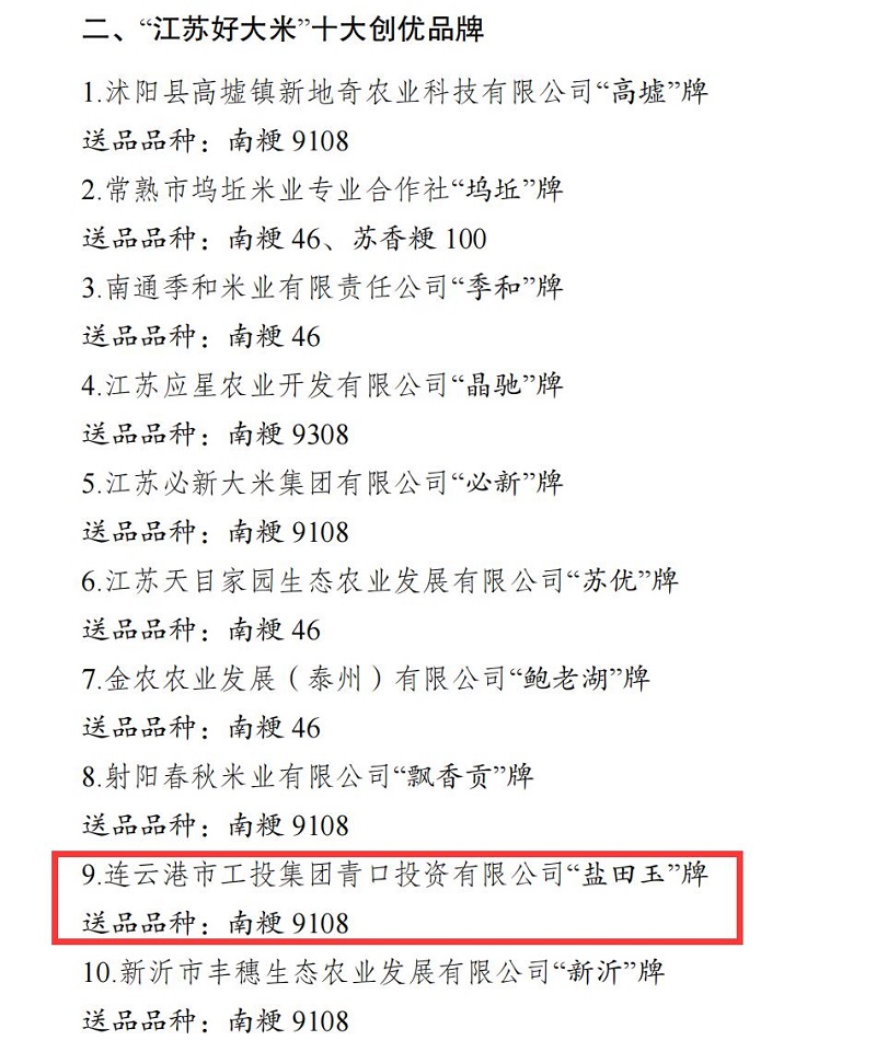 近日,第八屆江蘇好大米評(píng)鑒推介結(jié)果公布,“鹽田玉”品牌再創(chuàng)佳績,榮獲“江蘇好大米”十大創(chuàng)優(yōu)品牌。