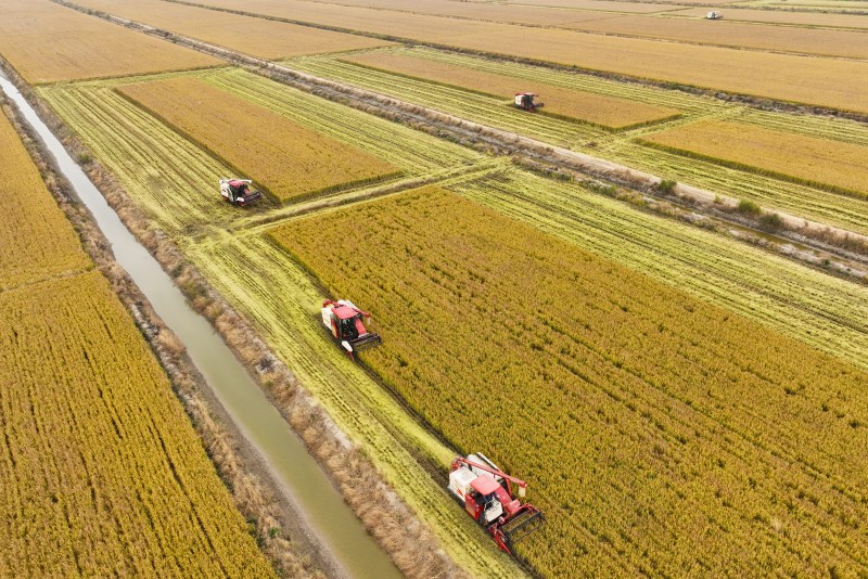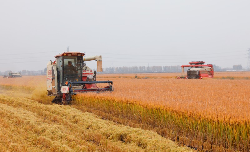 ? ? ? ?稻田里,收割機正馬力全開,不斷在田間穿梭,所到之處一排排水稻被整齊地收割下來,割稻、脫粒、吐稈一氣呵成,空氣中彌漫著稻谷清香。