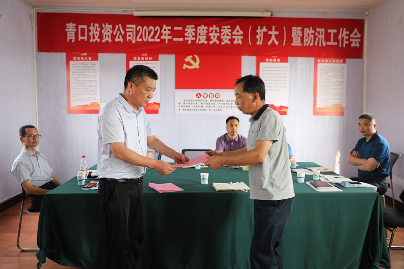 演練結束后,工作會在承擔主要防汛任務的三洋分場召開。會上,生產(chǎn)安全部匯報二季度安全工作情況,副總經(jīng)理許太冬傳達《關于深刻汲取近期事故教訓采取嚴厲措施堅決遏制事故多發(fā)勢頭的通知》,副總經(jīng)理楊守明布置公司安全工作及防汛工作,各單位遞交2022年度防汛工作責任書。