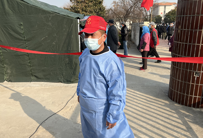圖為黨員宋世園正引導(dǎo)居民做好核酸檢測準備工作