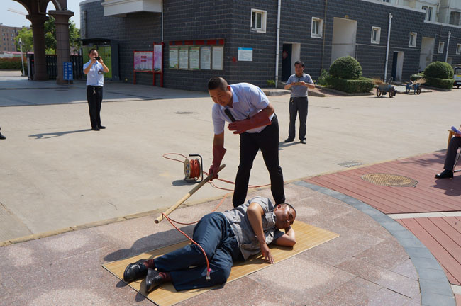 ? ? ? ? ?本次演練模擬一名物業(yè)維修人員施工不慎碰到裸露的電線,導致觸電倒地。在演練現(xiàn)場,專業(yè)電工、醫(yī)護人員先向觀摩人員詳細講解了觸電急救、人工呼吸及胸外心臟擠壓等救援理論知識,并進行施救演示。經(jīng)過 20多分鐘的演練,順利完成了演練任務。演練結(jié)束后,安全技術部負責人對演練情況進行綜合點評,并對泰祥員工安全知識進行培訓,泰祥公司現(xiàn)場發(fā)放了安全用電小常識等宣傳材料。通過此次演練使員工對觸電事故的應急救援步驟和方法有了更深的認識,進一步提高職工觸電急救的能力,有效地提高了職工防范安全風險的意識。