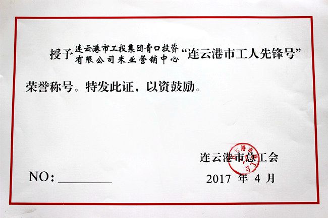 近日,公司米業(yè)營銷中心在連云港市總工會組織的 “2017年度連云港市工人先鋒號”評選活動中,被授予“工人先鋒號”榮譽(yù)稱號。