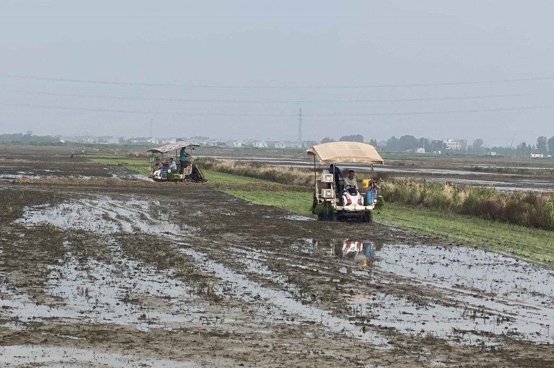 近日,大新農(nóng)場搶抓有利天時,與農(nóng)科院合作的新品種水稻啟動插秧作業(yè),機器手正熟練地操作插秧機在稻田里穿梭,一撮撮青翠的秧苗被整齊有序地插在水田里,呈現(xiàn)出一幅綠色生態(tài)畫卷。(王璐)