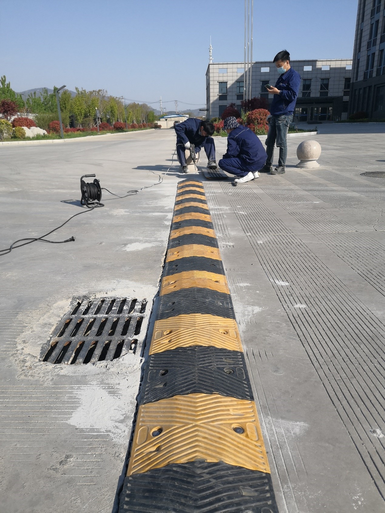 為了強(qiáng)化道路交通安全,公司在廠區(qū)主大門入口和停車場(chǎng)兩處加設(shè)減速帶。圖為安全管理部員工在現(xiàn)場(chǎng)施工。