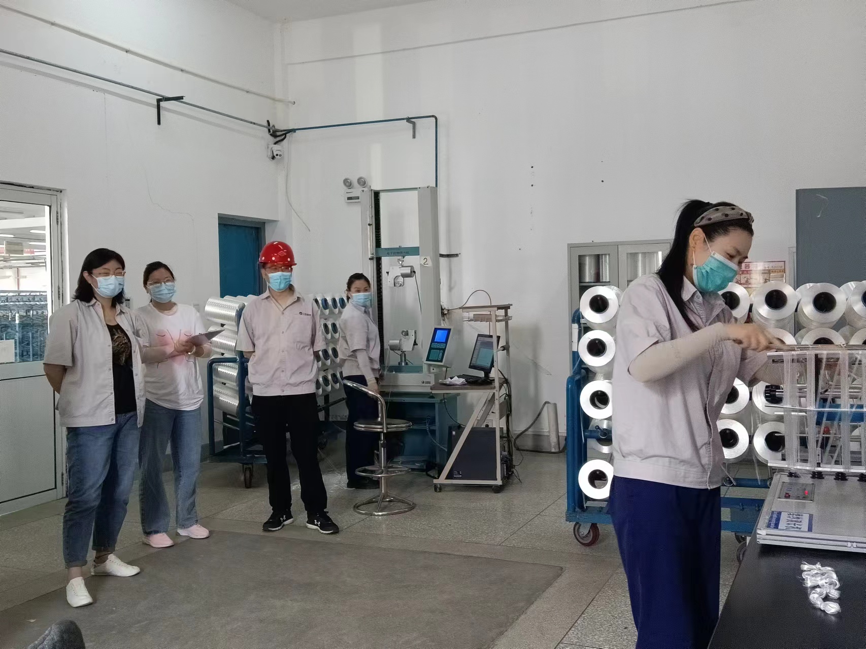 上午9:30,物檢班組緊接著開始比賽。纖度檢測首先上場的是王玉梅同志,掛絲、繞絲、打結(jié)、稱重有條不紊的完成了比賽。強(qiáng)度檢測比賽中侯義芹同志第一個出場,以幾乎完美的表現(xiàn)完成了比賽。經(jīng)過激烈的角逐,王娟同志以4分10秒05獲得了纖度檢測第一名,侯義芹同志1分51秒14獲得強(qiáng)度檢測第一名 。