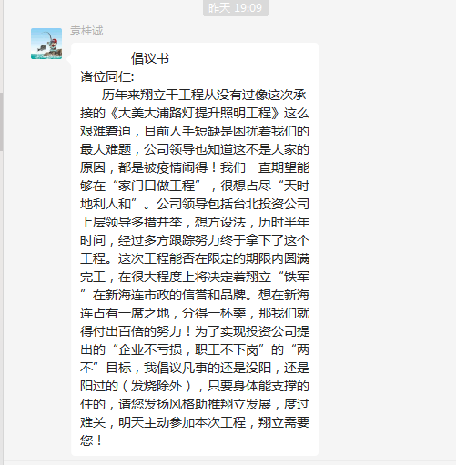 ? ? ? ??運(yùn)籌帷幄,統(tǒng)籌安排。每天早上7點多,都會看到翔立廠房前的靚麗風(fēng)景線,那是鐵軍們正在進(jìn)行早班會:強(qiáng)調(diào)工作需要注意的安全點,進(jìn)行現(xiàn)場分配工作,互相鼓勵打氣,充分調(diào)動大家的積極性;晚上結(jié)束一天勞累的工作,鐵軍們也沒有閑著,在工作群中熱烈的討論工作情況,大家心往一處想,勁往一處使,彼此間相互鼓勵,努力高質(zhì)量的完成路燈工作。雖然疫情影響減員嚴(yán)重,但是大美大浦亮化工程,7條主干道,翔立已經(jīng)完成了6條,大浦路需要把路燈上的方管變成圓管,才能進(jìn)行更換,翔立分公司未雨綢繆,及時聯(lián)系廠家送來配件,確保工程不停工。