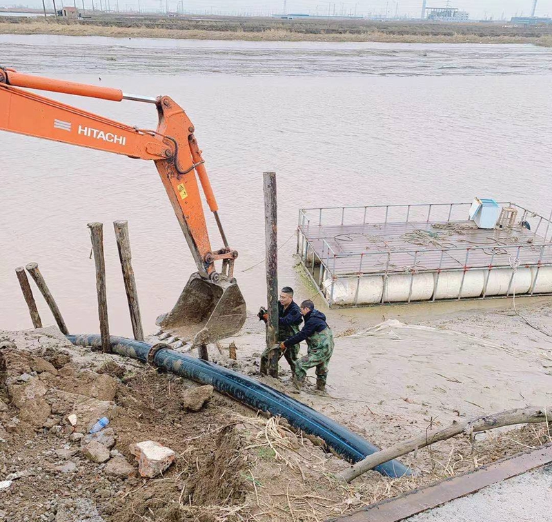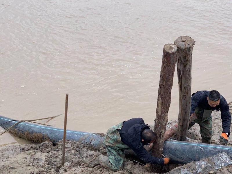 ?一想到昨天管道巡查到這里的情形,現(xiàn)在還讓人“心有余悸”!因管道地處善后河彎道處,常年的泄洪沖刮將河邊覆蓋管道的泥土沖刷卷走,使得岸邊泥土下原本穿越的PE315管道已經暴露出來,退潮時的旋流不斷地沖撞著漂浮起來的鈣液管道,劇烈抖動著的管道不時發(fā)出“噗噗的低吼”隨時可能折斷。埒子口潮河段是鈣液東輸灌西管道最長的一節(jié)過河穿越,全長約300米。穿越管道如果折斷在河底后果將不可想象、經濟損失也是不可估量的,這一幕讓在場所有人員都為之捏了一把汗!