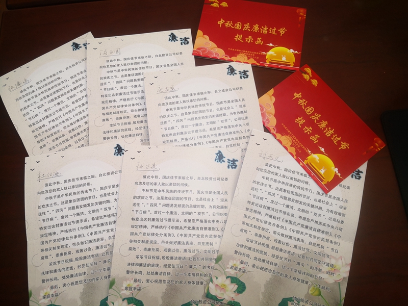 溫馨提示函早提醒。“值此中秋、國(guó)慶佳節(jié)來(lái)臨之際,臺(tái)北投資公司紀(jì)委向您和您的家人致以親切的問(wèn)候……時(shí)時(shí)警鐘長(zhǎng)鳴,處處廉潔自律,過(guò)一個(gè)幸福祥和的節(jié)日!”節(jié)前,公司通過(guò)廉潔提示函向黨員領(lǐng)導(dǎo)干部贈(zèng)送節(jié)日廉潔提醒,將廉潔過(guò)節(jié)的紀(jì)律要求融入節(jié)日祝福。