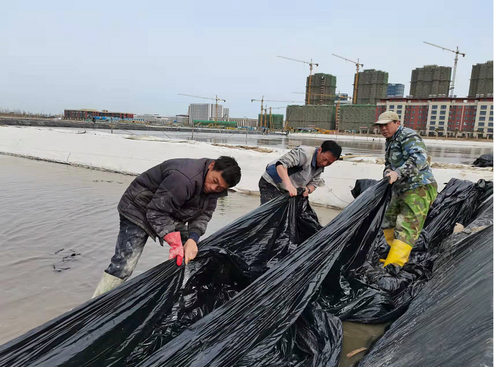 不負(fù)春光早起步,大干快上正當(dāng)時(shí)。隨著我市疫情剛一解封,海州灣公司礦鹽復(fù)產(chǎn)工程立即開啟加速“奔跑”模式,經(jīng)過前期充分的準(zhǔn)備和精心部署,在3月31日疫情解封的第一天,安排貨車將第一批塑布運(yùn)輸?shù)轿?。次日早?/span>7點(diǎn),海州灣公司和翔立分公司全體員工在先鋒班組集合,開啟第一輪塑布安裝以及鹵水灌池工作,搶抓“小滿”前后十八天的池內(nèi)長(zhǎng)鹽黃金期。
