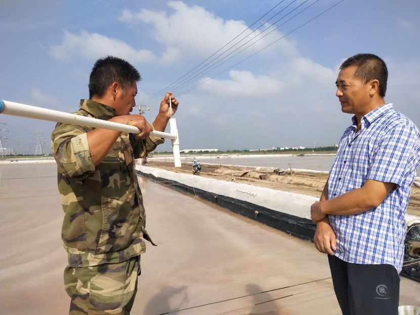 上圖為礦鹽生產(chǎn)顧問王緒前在現(xiàn)場指導測量鹵水波美度及相關(guān)數(shù)據(jù)