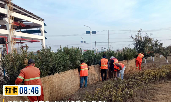 風(fēng)障防寒加速進(jìn)行。該分公司采購草簾500余個,對金港路、泰和路夾竹桃等不耐寒綠植精心呵護。確保低溫植株不被凍傷,不出現(xiàn)大面積凍害現(xiàn)象。目前已圍草簾300余個。