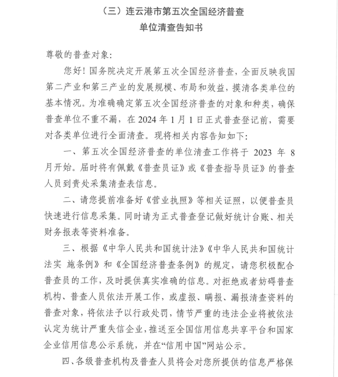 按照《全國經(jīng)濟普查條例》規(guī)定,國務院決定于2023年開展第五次全國經(jīng)濟普查,為提高經(jīng)濟普查質(zhì)量,進一步推進普查工作順利開展,公司按照上級第五次全國經(jīng)濟普查宣傳動員工作要求,現(xiàn)將《連云港市第五次全國經(jīng)濟普查單位告知書》公示如下: